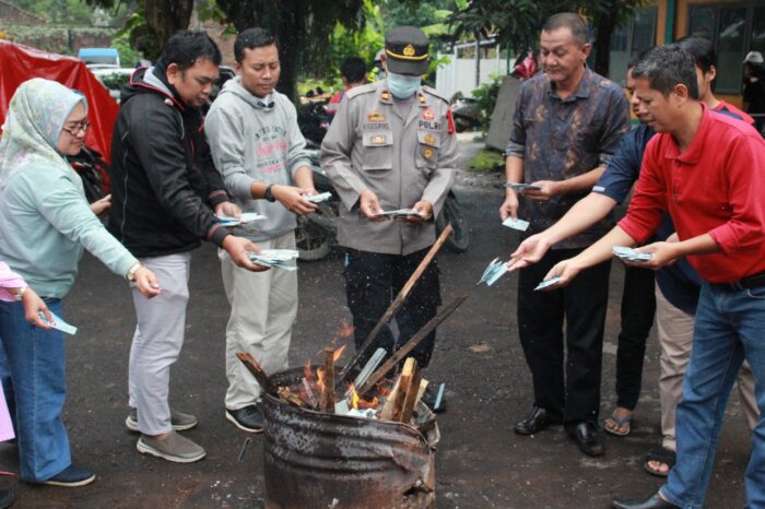 Terpantau, pemusnahan e-KTP didampingi kepolisian Polsek Karangtengah dihalaman Disdukcapil Cianjur.