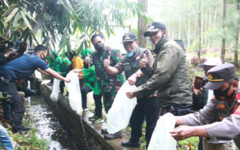 Foto | Kepala Dinas Pertanian, Pangan dan Perikanan Kabupaten Tasikmalaya Drs. H. Heri Sogiri MM, sedang memberikan benur udang Vaname untuk ditebar di tambak udang yang dikelola oleh Kelompok Budidaya Tambak Udang Vaname Mandala Berkah Bahari