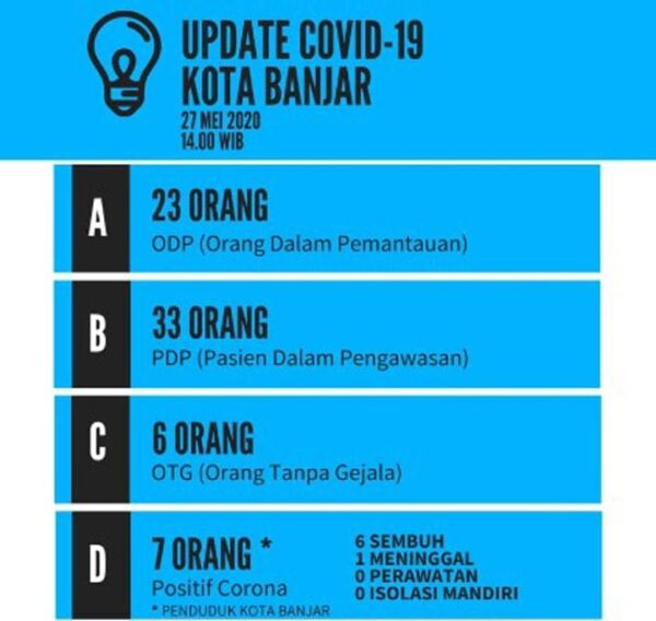 Sementara itu, Gugus Tugas Covid-19 Kota Banjar mengumumkan data per 27 Mei 2020, sampai pukul 14.00 WIB. Tercatat ada 23 ODP, 33 PDP, 6 OTG, 7 orang positif.