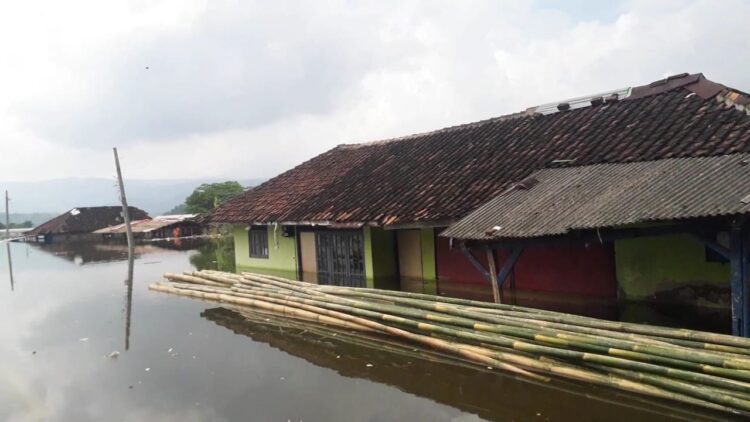Tampak, di lokasi tersebut ada bangunan rumah penjual bakso yang seluruhnya terendam meski belum tenggelam.
