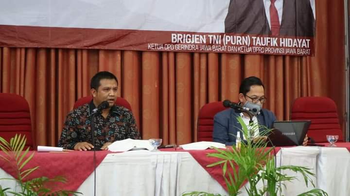 Panitia mengundang Ketua KPU Jawa Barat, Kang Rifqi Ali Mubarok dan Anggota Bawaslu Jabar, Kang Zaki Hilmi untuk memberikan materi bagi para anggota DPRD dari fraksi Gerindra.