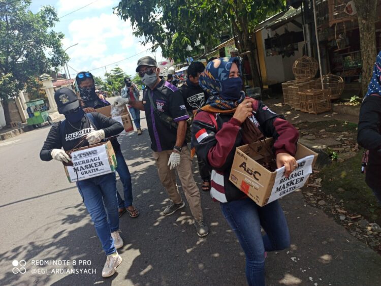 KAPOL.ID – Sebanyak 300 masker dibagikan secara gratis oleh anggota grup facebook Tepang Sono Wargi Ciamis (TSWC) kepada pengendara yang melintas di perempatan lampu merah Pasar Ciamis,Minggu, (12/4/2020) pagi.