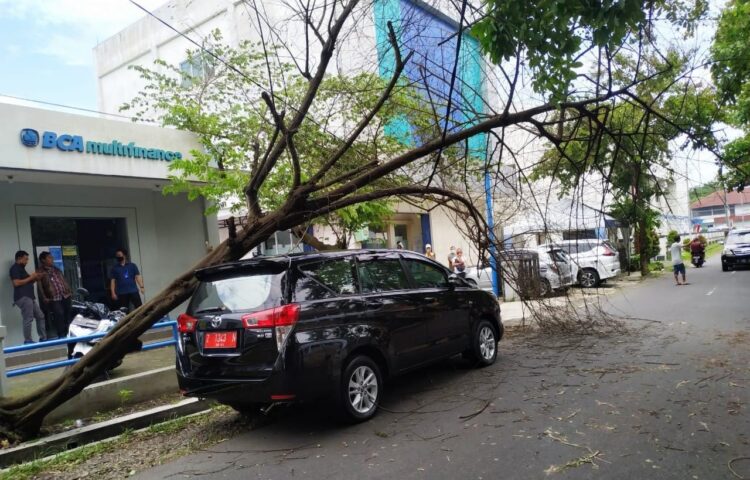 Pohon tumbang terjadi di Jalan Terusan BCA tepatnya depan SMA Pancasila. Sebuah mobil plat merah yang terparkir jadi korban.