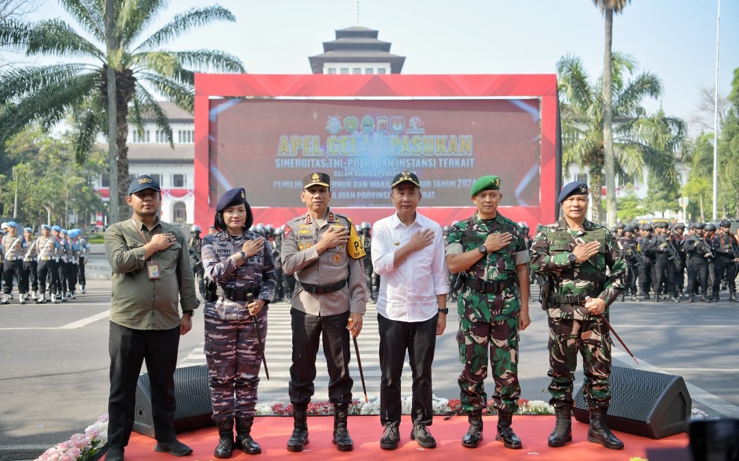 Apel Gelar Pasukan Pengamanan Pilkada Jabar 2024 di depan Gedung Sate Jl. Diponegoro Kota Bandung, Selasa (20/08/2024). Kegiatan dihadiri oleh Forkopimda Jabar, PJU Kodam III/Siliwangi, PJU Polda Jabar serta pasukan dari TNI, Polri dan instansi terkait.