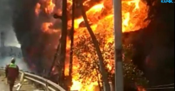 CIMAHI, (KAPOL) – Api yang berkobar dari pipa Pertamina sempat membesar. Kendaraan yang melintas berhasil menghindari api yang meluap-luap. Para petugas Damkar langsung turun ke lokasi untuk penanggulangan.