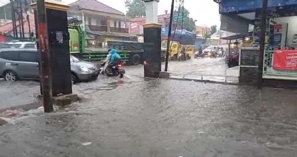 KAPOL.ID – Hujan deras membuat drainase di kawasan Jalan Raya Leles Kab. Garut meluap dan air pun menggenangi badan jalan, Sabtu (6/3/2021).