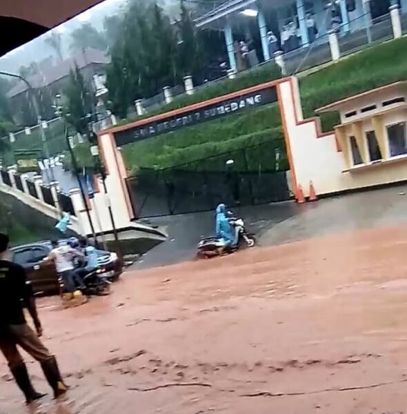 Terpantau, air bercampur lumpur imbas dari pembangunan perumahan Rancamulya Residence hingga menutup sebagian badan jalan di samping SMA 2 Sumedang itu.