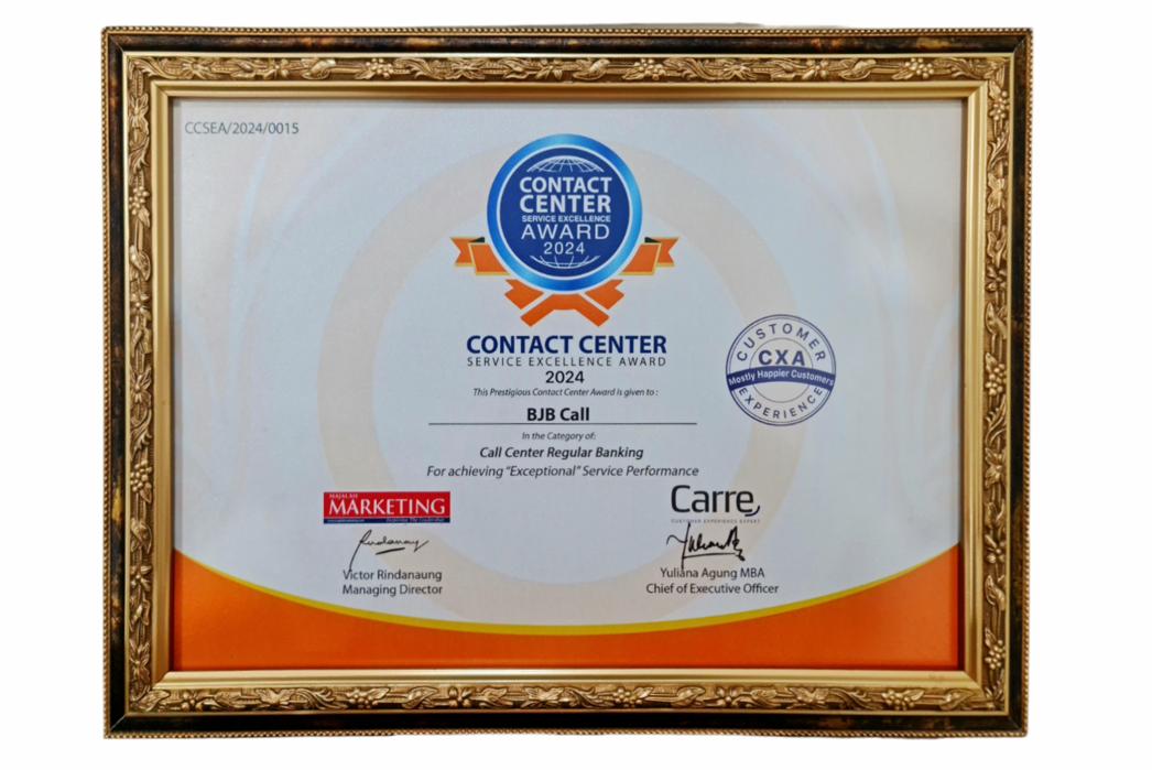 Bank bjb meraih penghargaan kategori Call Center Regular Banking melalui layanan bjb Call dengan mendapatkan score index 96,364 (Exceptional, Mostly Happier Customers).