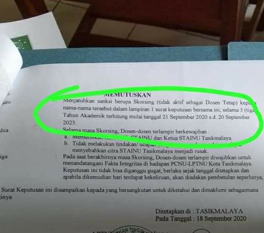 Para dosen Sekolah Tinggi Agama Islam NU (STAINU) Tasikmalaya menyampaikan keberatannya dengan keputusan PCNU-LPTNU Kota Tasikmalaya yang menskorsing pengajar selama 3 tahun.