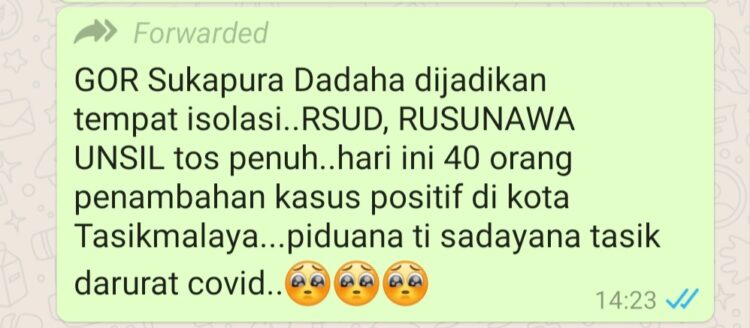 “GOR Sukapura Dadaha dijadikan tempat isolasi..RSUD, RUSUNAWA UNSIL tos penuh..hari ini 40 orang penambahan kasus positif di kota Tasikmalaya…piduana ti sadayana tasik darurat covid..”