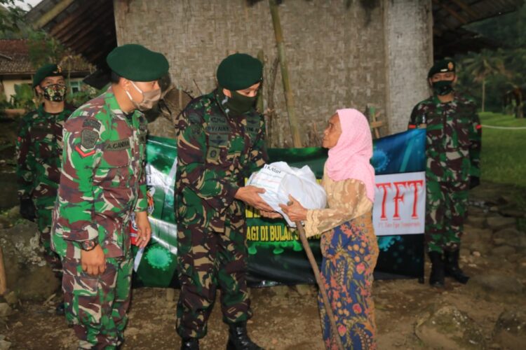 Brigif Raider 13/Galuh membagikan paket sembako di Kampung Antek Hilir Desa Malatisuka Kecamatan Gunung Tanjung Kabupaten Tasikmalaya, Sabtu (16/5/2020).