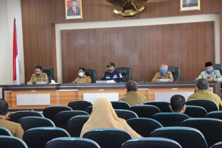 KAPOL.ID – Bupati Ciamis Herdiat Sunarya Bersama Wakil Bupati, MUI dan SKPD terkait menggelar pertemuan via video conference dengan Camat dan Kepala Desa se-Kabupaten Ciamis terkait pengarahan dan evaluasi penanganan Covid-19 di Kabupaten Ciamis, dari Aula Adipati Kusumadiningrat Sekretariat Daerah Kabupaten Ciamis, Senin (27/4/2020).