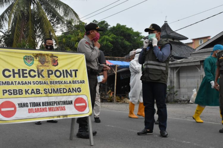 KAPOL.ID – Bupati Sumedang, H. Dony Ahmad Munir didamping Kepala Bagian Humas dan Protokol Setda Kabupaten Sumedang, Asep Tatang Sujana melaksanakan monitoring posko check point C PSBB di perbatasan wilayah Kecamatan Ujungjaya, Rabu, (6/5/2020).