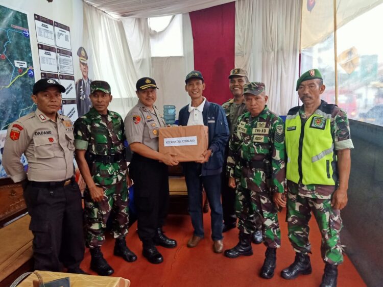 Camat Cimalaka beserta rombongan memberikan bingkisan untuk para personil pos pengamanan di Pospam Cimalaka.
