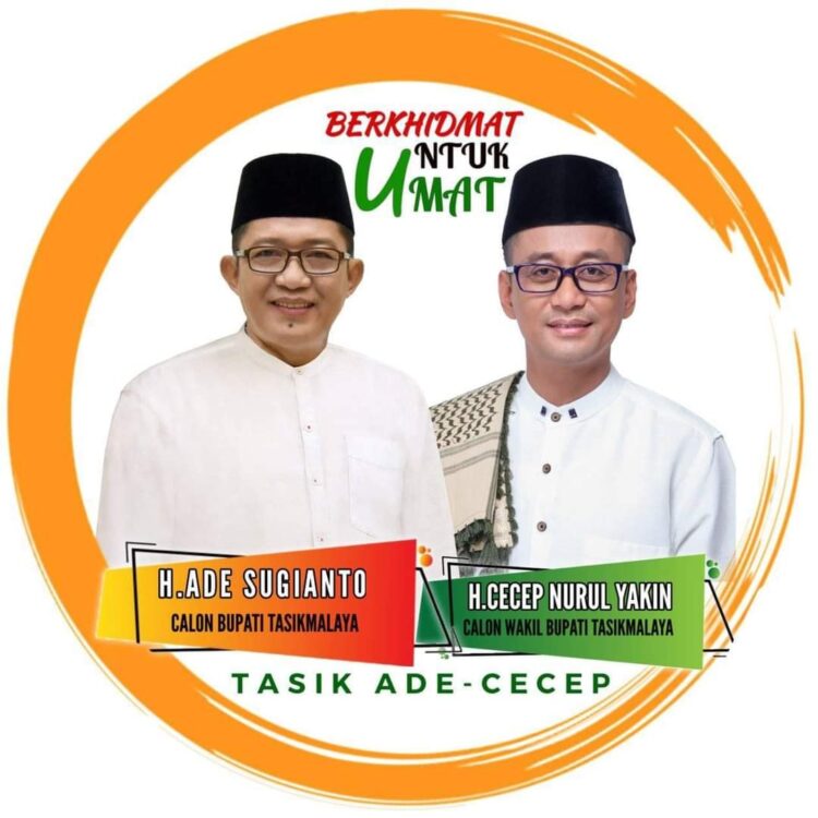 Berkhidmat untuk Umat . Caption ini dibuka dengan klausa Berkhidmat untuk Umat sebagai judul. Isi caption menginformasikan figure pasangan calon bupati dan wakil bupati dengan nama masing-masing. Ade Sugianto (Calon Bupati Tasikmalaya) dan Cecep Nurul Yakin (Calon Wakil Bupati Tasikmalaya). Di bagian penutup ada penegasan ulang Tasik Ade-Cecep.