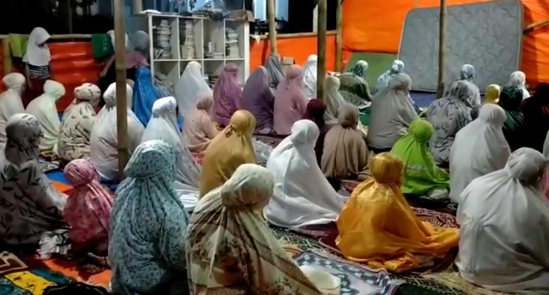 Tampak para warga yang sebagian masih menempati tenda pengungsian itu, dengan khusuk melaksanakan salat tarawih di masjid darurat yang terbuat dari bambu yang ditutupi terpal.