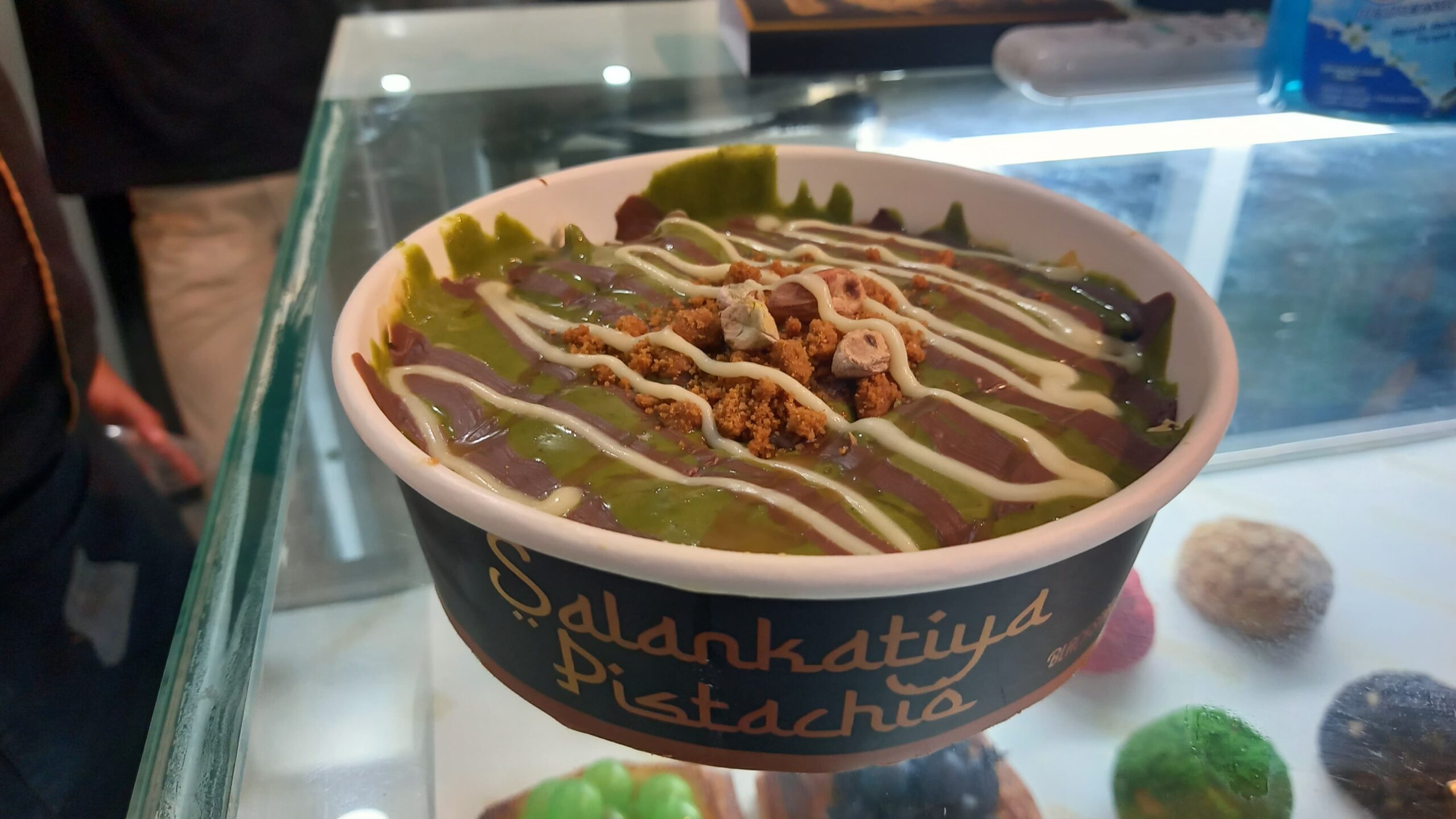 Salankatiya merupakan perpaduan rasa dari puding vanila, cream cheese, taburan kunafa dan puff pastry. Di bagian atasnya disiram dengan saus pistachio, saus coklat dan crumble biscuit lotus.