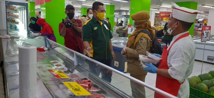 Para petugas juga melakukan cek suhu penyimpanan daging yang berada di salah satu pasar swalayan yang berlokasi di Jalan Taman Pahlawan, Senin (18/5/2020).