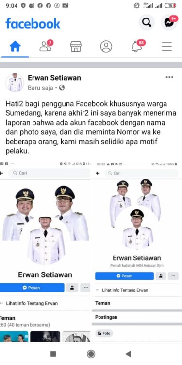KAPOL.ID – Wakil Bupati Sumedang, H. Erwan Setiawan, SE mengaku tak nyaman akubat ulah oknum yang membuat akun facebook palsu mengatasnamakan dirinya.