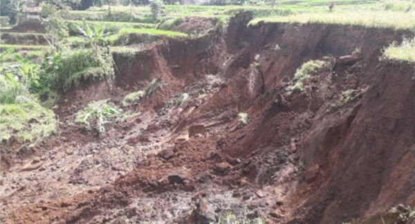 “Air masuk ke dalam celah retakan sawah. Setelah itu tanahnya tidak mampu menahan air sehingga akhirnya terjadi longsor dan menimbun sawah yang berada di bawah,” ujarnya
