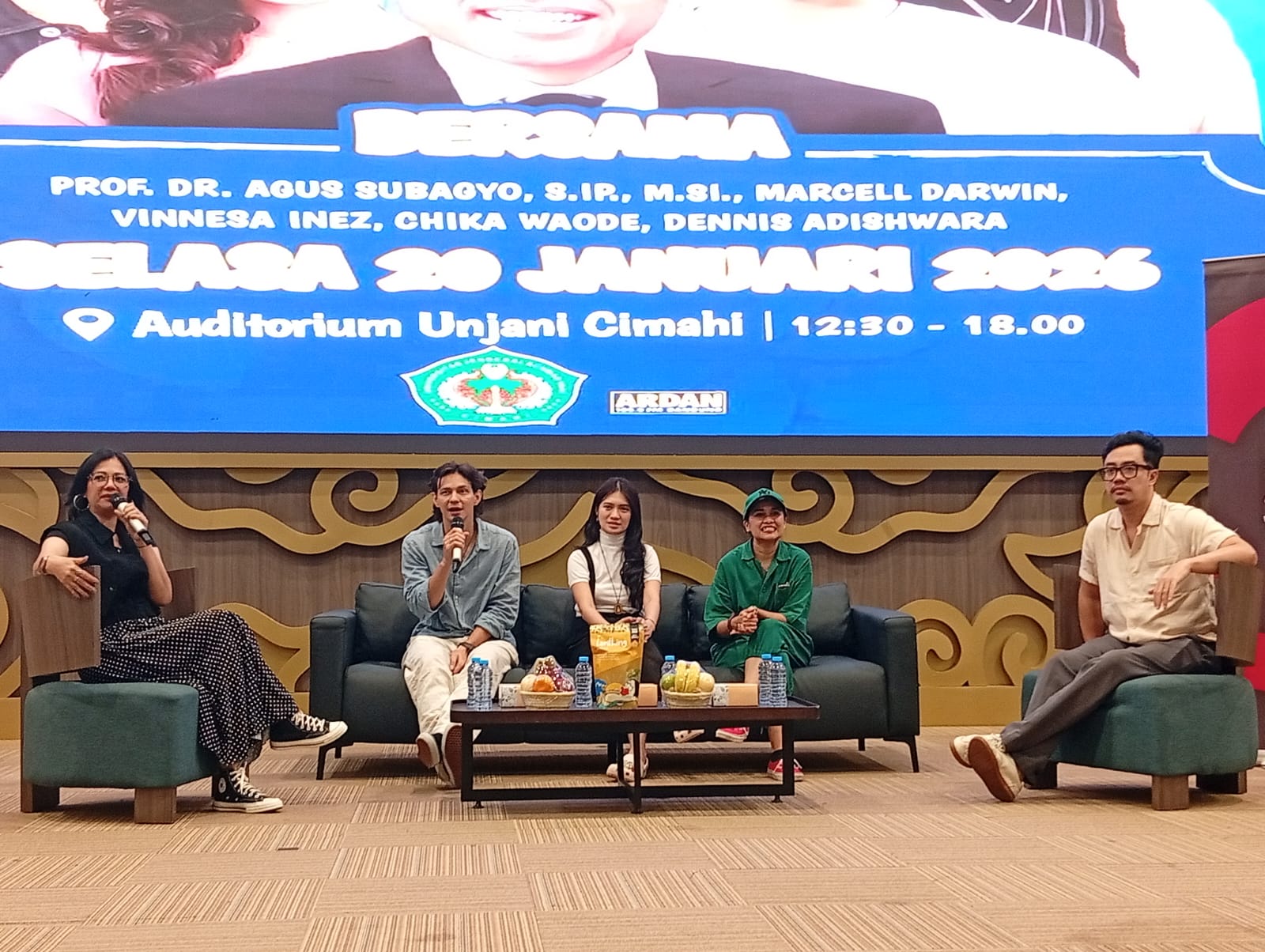 Pemain Film DALAM SUJUDKU yang hadir di Kampus Unjani, yakni Marcell Darwin, Vinnesa Inez, Chika Waode, Dennis Adishwara.