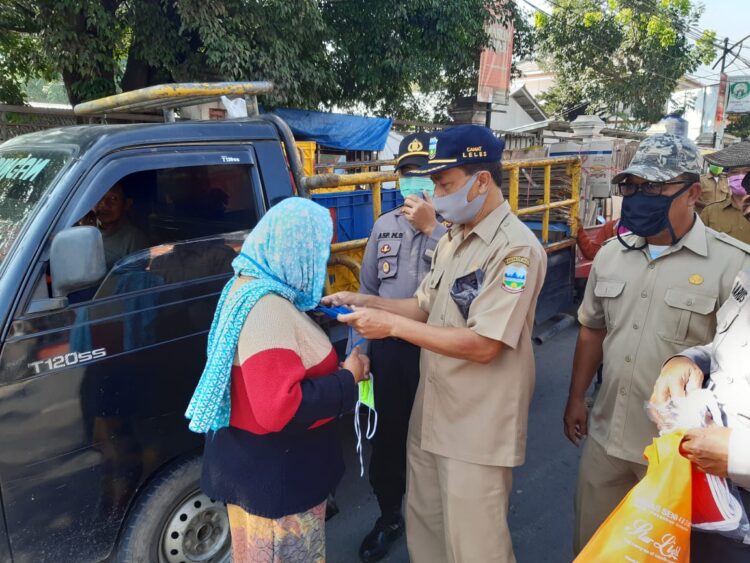 Terpantau Camat Leles, Asep Suhendar bersama Kapolsek AKP Asep Muslihat serta Danramil Kapten Inf Damo, tengah sibuk membagikan masker.