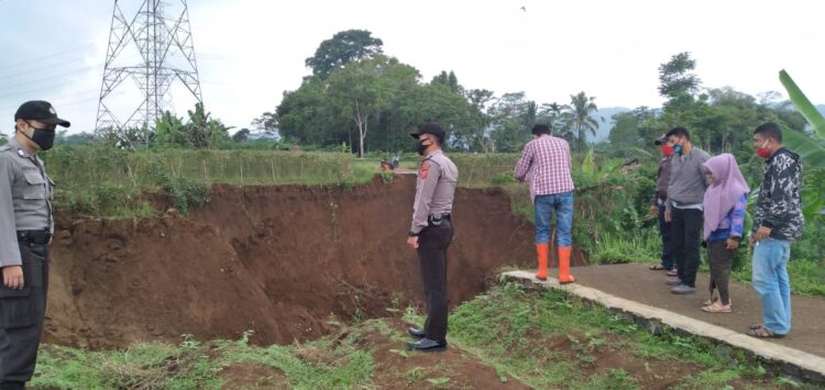 Ternyata, tanah dengan panjang sekitar 100 meter merosot dari ketinggian mencapai 25 meter. Hampir satu hektar lahan pesawahan dan jalan rusak parah.