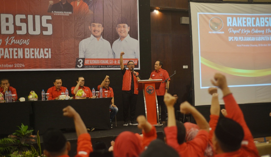 KAPOL.ID — Pasangan Calon Gubernur dan Wakil Gubernur Jawa Barat, Jeje Wiradinata dan Ronal Surapradja menghadiri rapat kerja cabang khusus (Rakercabsus) PDI Perjuangan Kabupaten Bekasi pada Minggu (20/10/24).