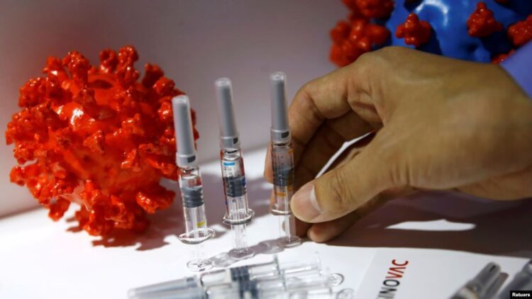 Kandidat vaksin virus corona dari Sinovac Biotech Ltd dipamerkan dalam stannya untuk dipajang selama Cina International Fair for Trade in Services (CIFTIS) 2020, setelah wabah Covid-19, di Beijing. (Foto: Reuters)