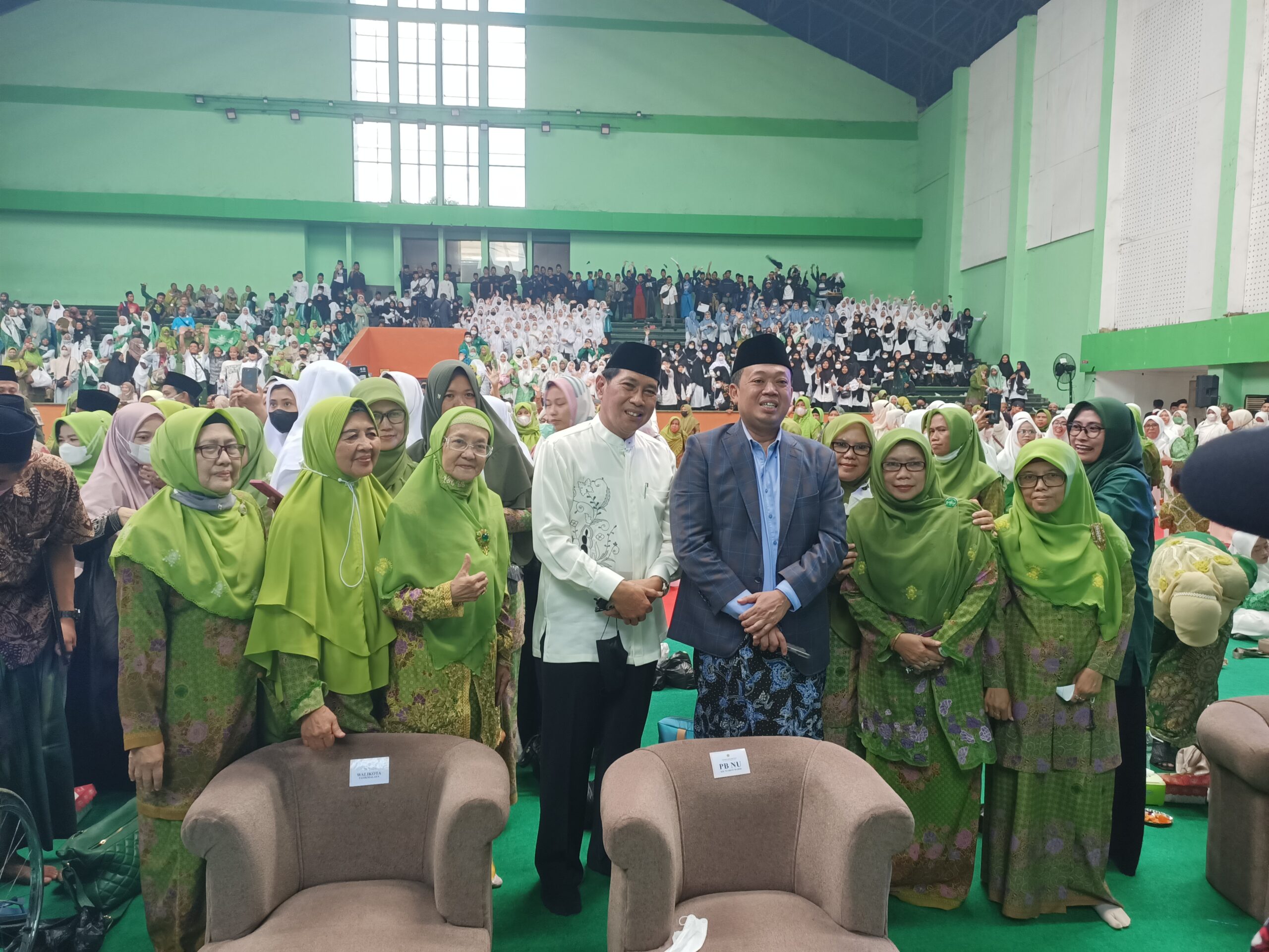 Nusron Wahid (mengenakan jas dan peci) berdampingan dengan Wali Kota Tasikmalaya, H. Muhammad Yusuf saat menghadiri Harlah ke-96 NU tingkat Kota Tasikmalaya di GOR Sukapura Dadaha, Selasa (8/3/2022).*