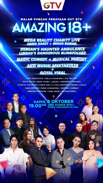 Saksikan kemeriahan malam puncak ulang tahun GTV : Amazing 18+ Kamis 8 Oktober 2020, live pukul 19.00 WIB di GTV!