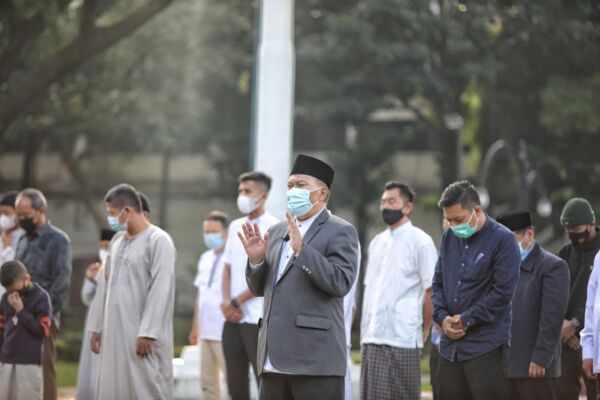 Berpakaian koko putih dibalut jas hitam, serta kopiah hitam lengkap dengan masker, Oded memimpin langsung salat berjamaah pada pukul 6.45 WIB.