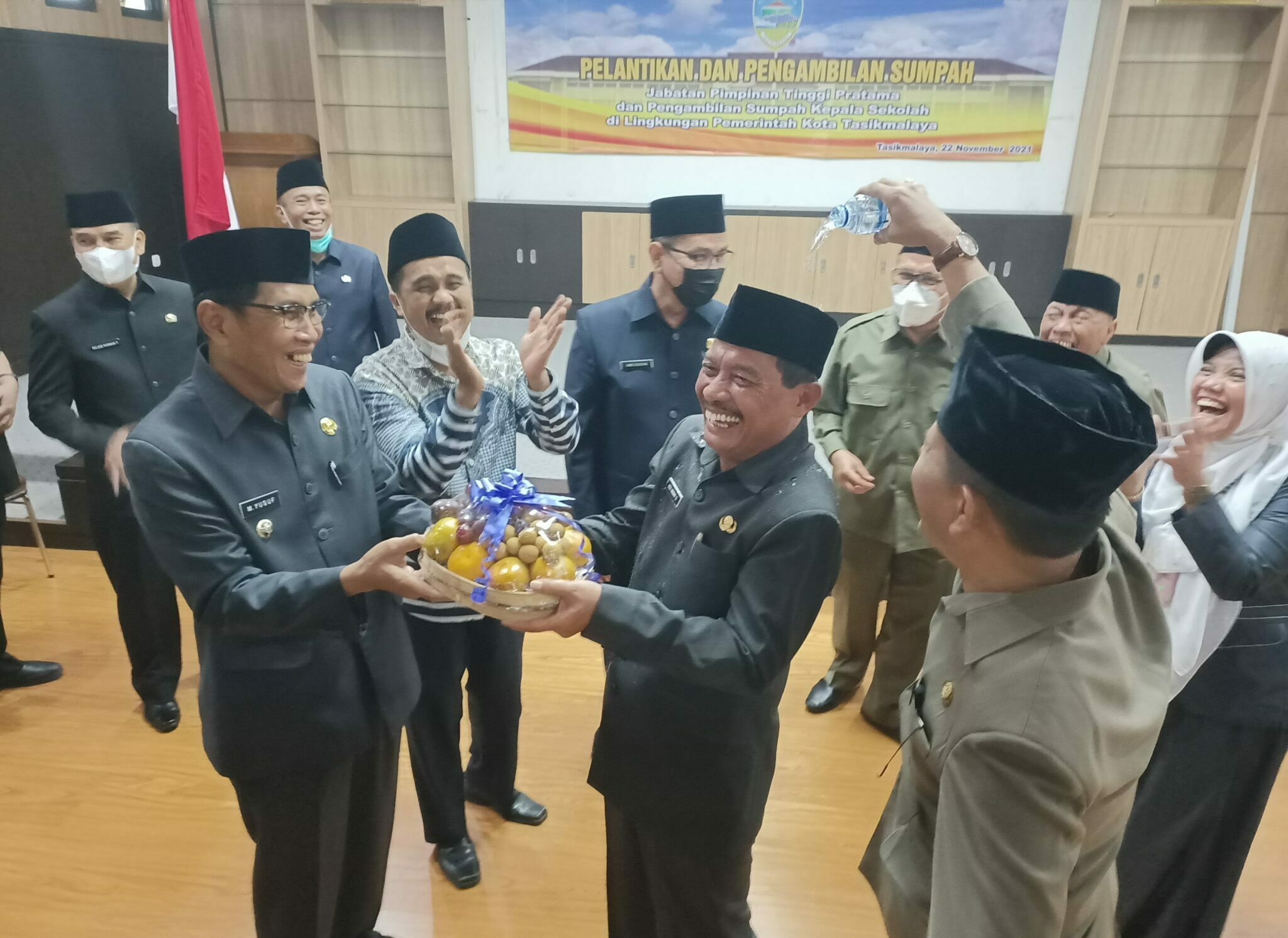 Kepala BPBD Kota Tasikmalaya Ucu Anwar disiram air seusai prosesi pelantikan di Aula Balai Kota Tasikmalaya, Senin (22/11/2021).*