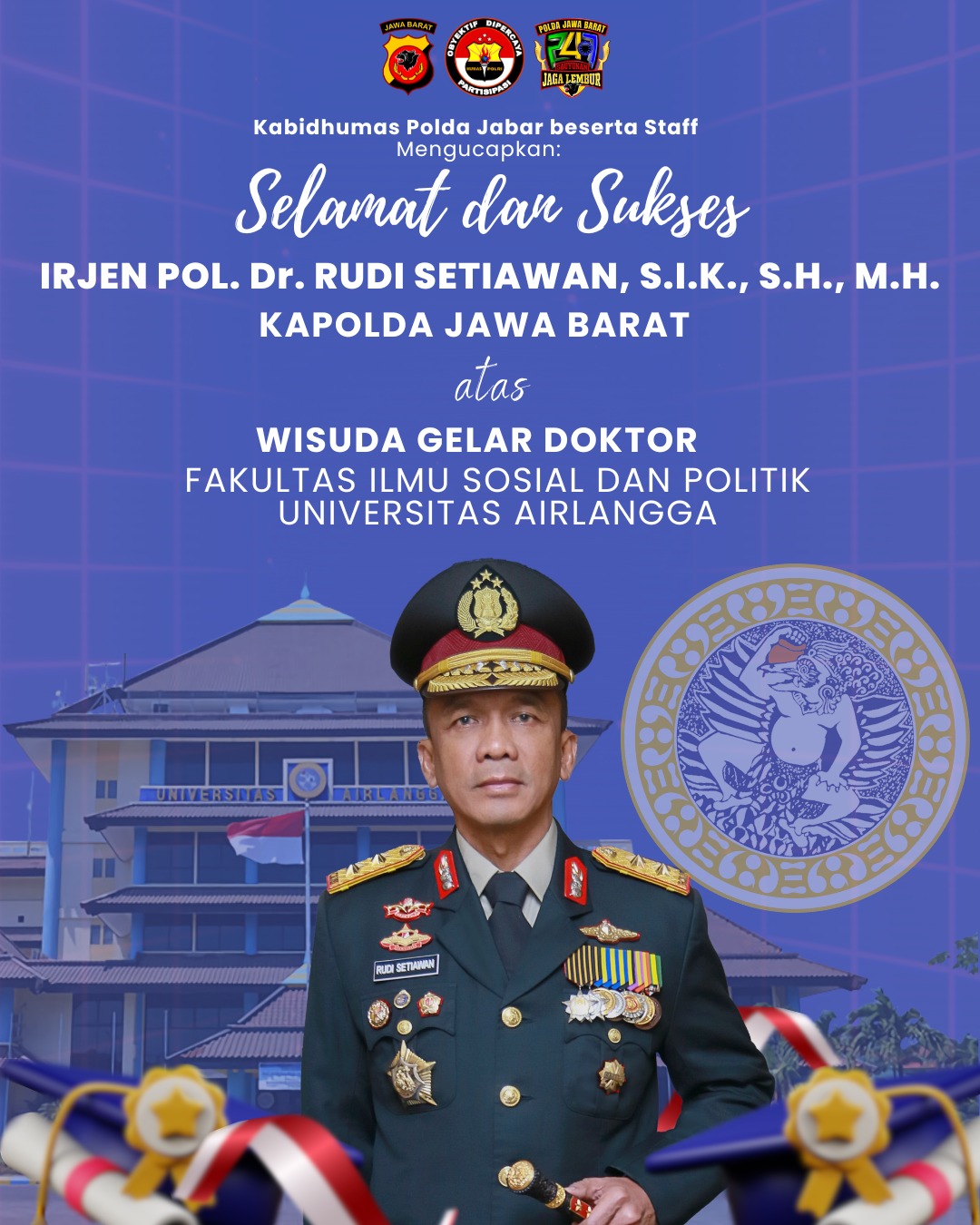 KAPOL.ID – Kapolda Jabar, Irjen Pol. Dr. Rudi Setiawan, S.I.K., S.H., M.H., resmi meraih gelar Doktor dari Fakultas Ilmu Sosial dan Ilmu Politik (FISIP) Universitas Airlangga (Unair).