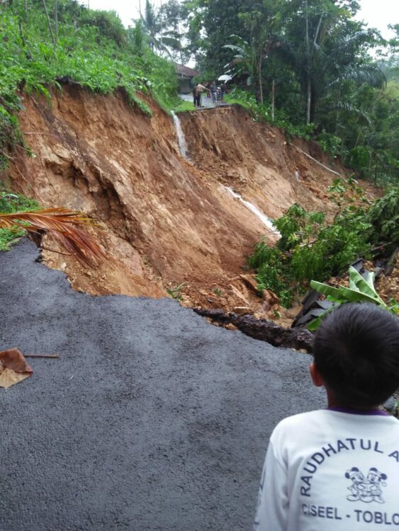 Seperti yang terjadi di dekat Goa Ucing, Desa Karyabakti, Kec. Parungponteng. Sekitar 50 meter ruas jalan amblas, akibatnya lalu-lintas Parungponteng-Pamijahan terputus total.