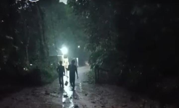 Di bawah penerangan terbatas, warga bahu-membahu menyingkirkan gundukan tanah dan batu agar sirkulasi ekonomi dan mobilitas warga tidak terhenti lama.