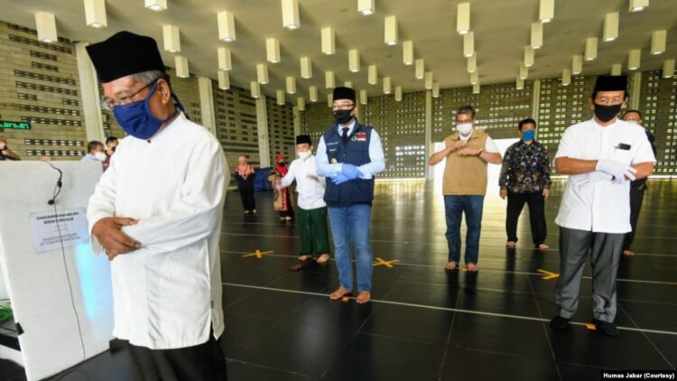 “Masuk ke dalam, siap shalat, para jemaah harap melihat ke bawah, kalau tandanya silang itu titik yang tidak boleh dipakai untuk shalat, maka shalat boleh berjarak,” ujarnya mencontohkan protokol di masjid.