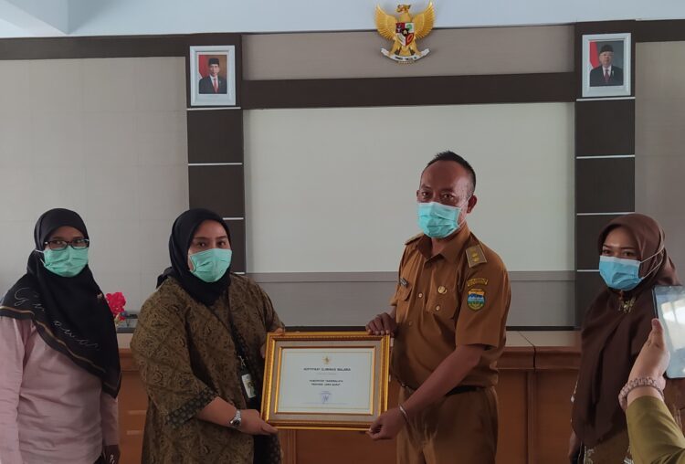 Kepala Seksi Pengendalian Malaria Kementerian Kesehatan RI, Helen Dewi Pramoswari menyerahkan Sertifikat Eliminasi Malaria pada Senin (11/1/2021). Kebid P2P Dinkes Kabupaten Tasikmalaya, Atang Sumardi menerimanya di aula kantor Dinkes.