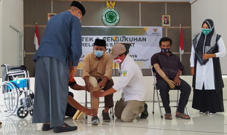 KAPOL.ID—Kaki dan tangan palsu serta kursi roda Baznas Kabupaten Tasikmalaya salurkan kepada mustahik. Simbolis penyerahannya berlangsung di Gedung MUI, Kamis (4/2/2021).