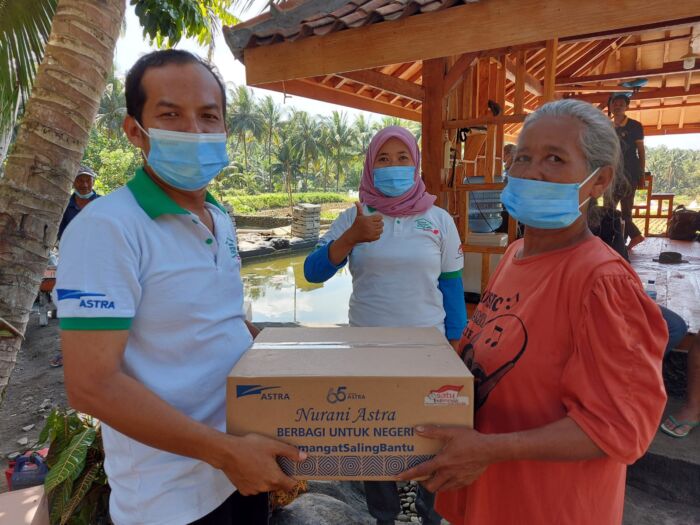 Kepala Desa Cintakarya Wawang Darmawan saat memberikan bantuan sembako dari Astra melalui KBA Nusantara Pangandaran.