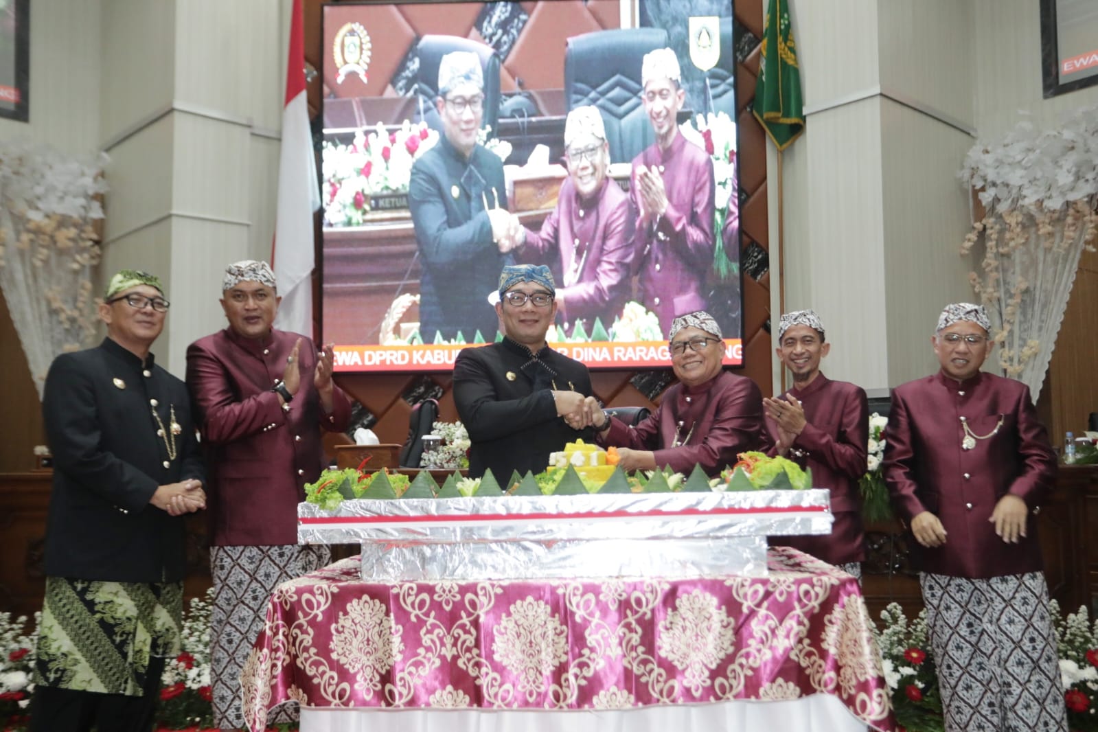 Dalam rapat Paripurna Istimewa tersebut, para anggota DPRD, Plt Bupati Bogor dan Forkopimda termasuk Kang Emil kompak mengenakan pakaian adat Sunda lengkap.
