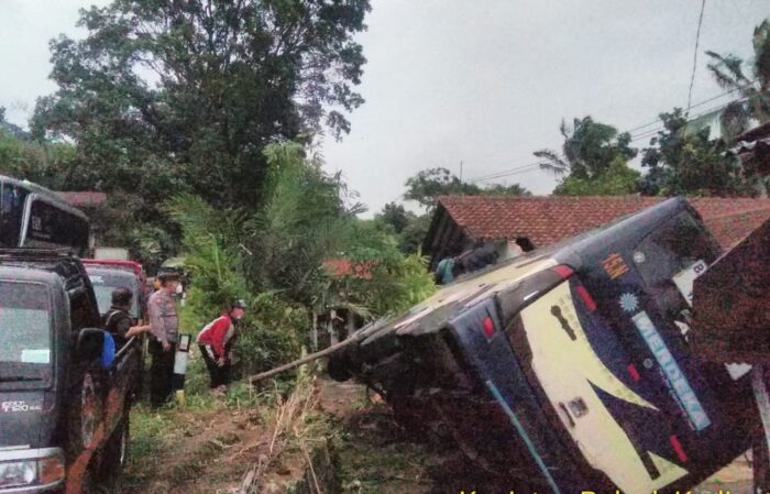 Bus Merdeka jurusan Jakarta-Banjar terguling di Jalan Raya Kadipaten, Kampung Cibahayu, Desa Cibahayu, Kecamatan Kadipaten, Kabupaten Tasikmalaya, Kamis (17/2/2022).