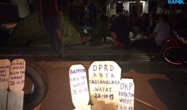 Tulisan dalam nisan itu seolah DPRD Kota Tasikmalaya telah wafat. Selain itu, mahasiswa juga membentangkan spanduk dwngan tulisan kecaman.