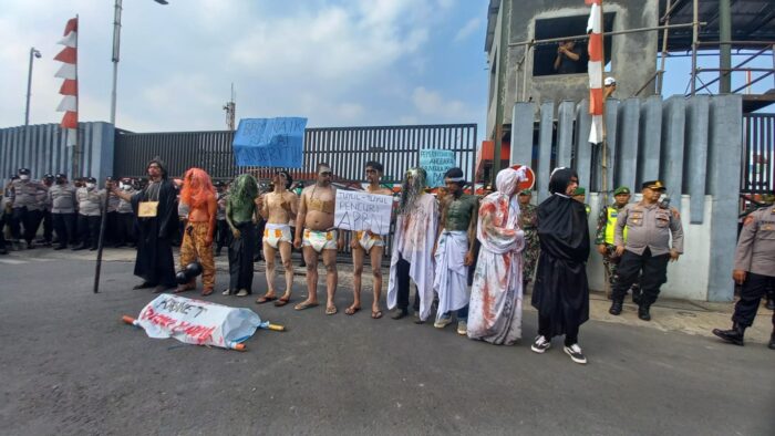 Mereka berjalan kaki dari Jalan Dokar menuju lokasi terminal BBM di Jalan Garuda Kota Tasikmalaya lalu melakukan aksi teaterikal.