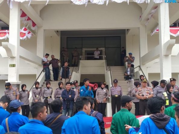 TASIKMALAYA, (KAPOL).- Puluhan mahasiswa dari Aliansi Organisasi Mahasiswa Badan Eksekutif Mahasiswa Tasikmalaya (BEM). (STIA YPPT PRIATIM, UMTAS, BSI, DCI Komputer) dan sebagian buruh tergabung Serikat buruh Tasikmalaya, gelar aksi unjukrasa ke DPRD Kota Tasikmalaya, Rabu (9/10/2019).
