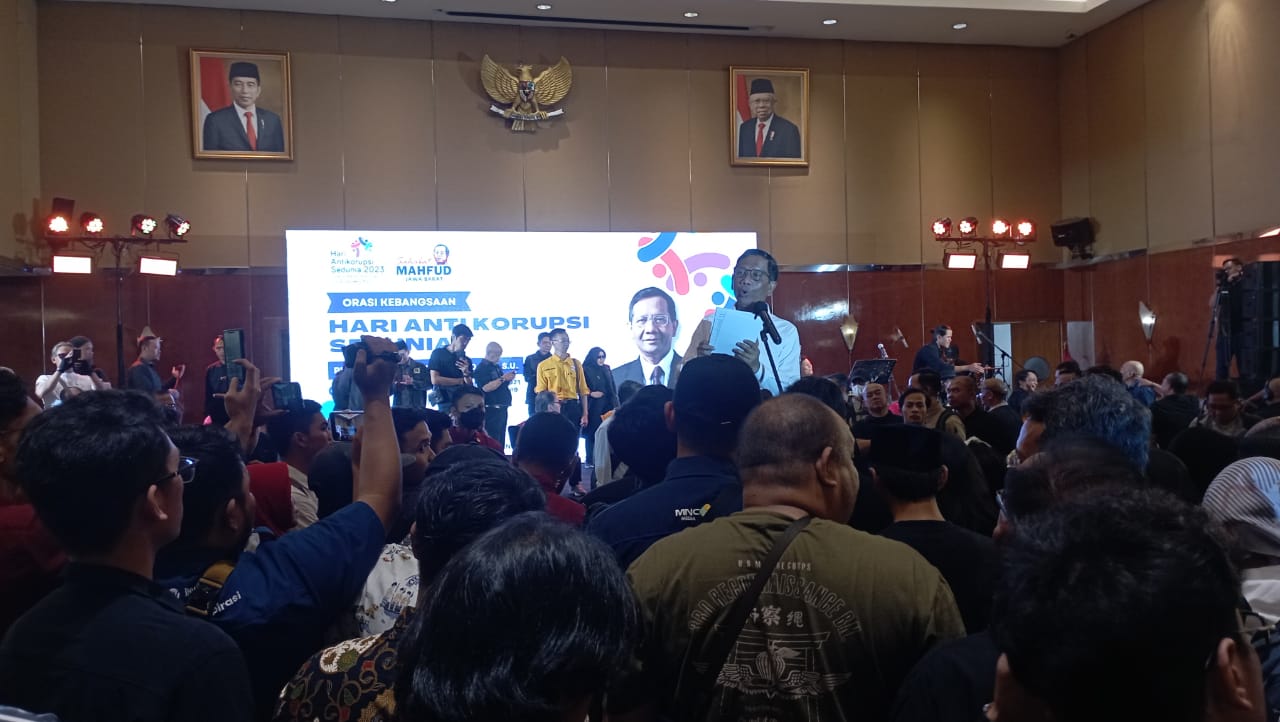 Terpantau, di hadapan relawan yang juga dihadiri oleh ribuan elemen masyarakat yang terdiri dari sebagian besar pemuda Gen Z dan milenial, Mahfud memberikan orasi kebangsaan dalam pengatan Hari Anti Korupsi tahun ini.