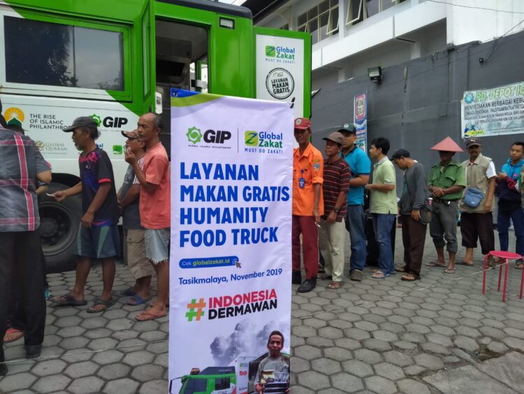 TASIKMALAYA, (KAPOL).-  Humanity Food Truck ACT Tasikmalaya bagikan 500 paket makanan bagi warga sekitar Masjid Agung Kota Tasikmalaya, Minggu (24/11/2019).