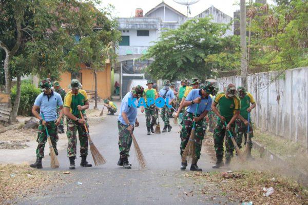Pasukan gabungan itu melakukan gotong royong bersih-bersih lingkungan pemukiman warga di sekitar Taman Makam Pahlawan Kusumah Bangsa Kota Tasikmalaya.