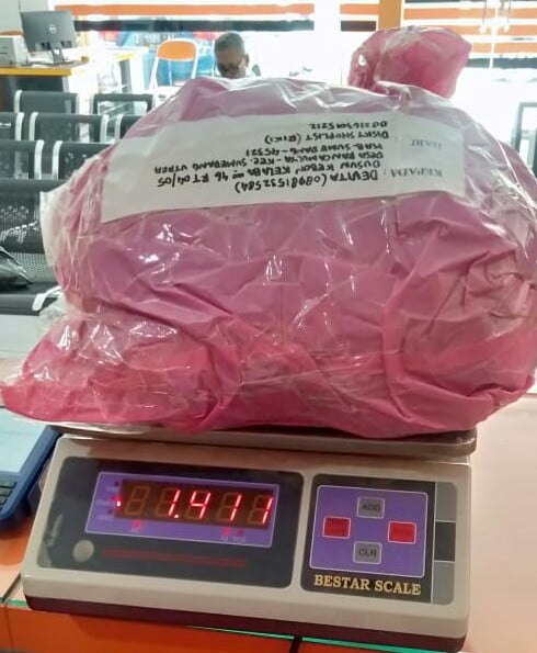 Ganja dibalut dengan jaket warna biru dongker dan dibungkus dengan kantung plastik warna pink dan dililit lakban bening, dengan berat kotor seberat 1.411 Gram yang tergeletak di atas lantai ruang tamu rumah tersangka.