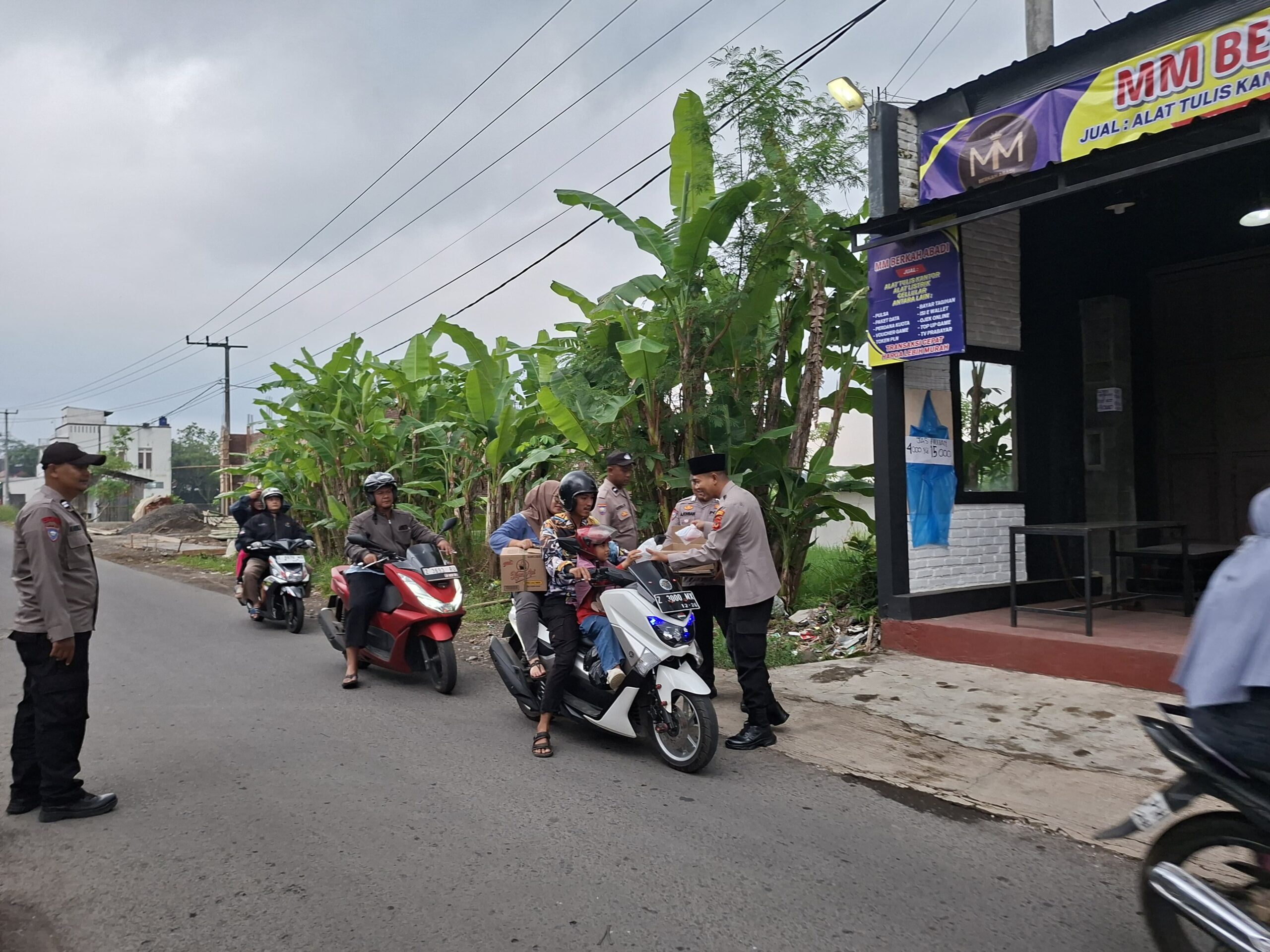 Bukan untuk penyekatan atau patroli biasa, melainkan untuk berbagi keberkahan di bulan suci. Di bawah rintik hujan, nampak para personel polisi tetap berdiri tegak, membagikan paket takjil gratis kepada setiap pengendara yang melintas di depan Mapolsek.